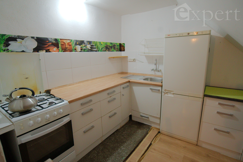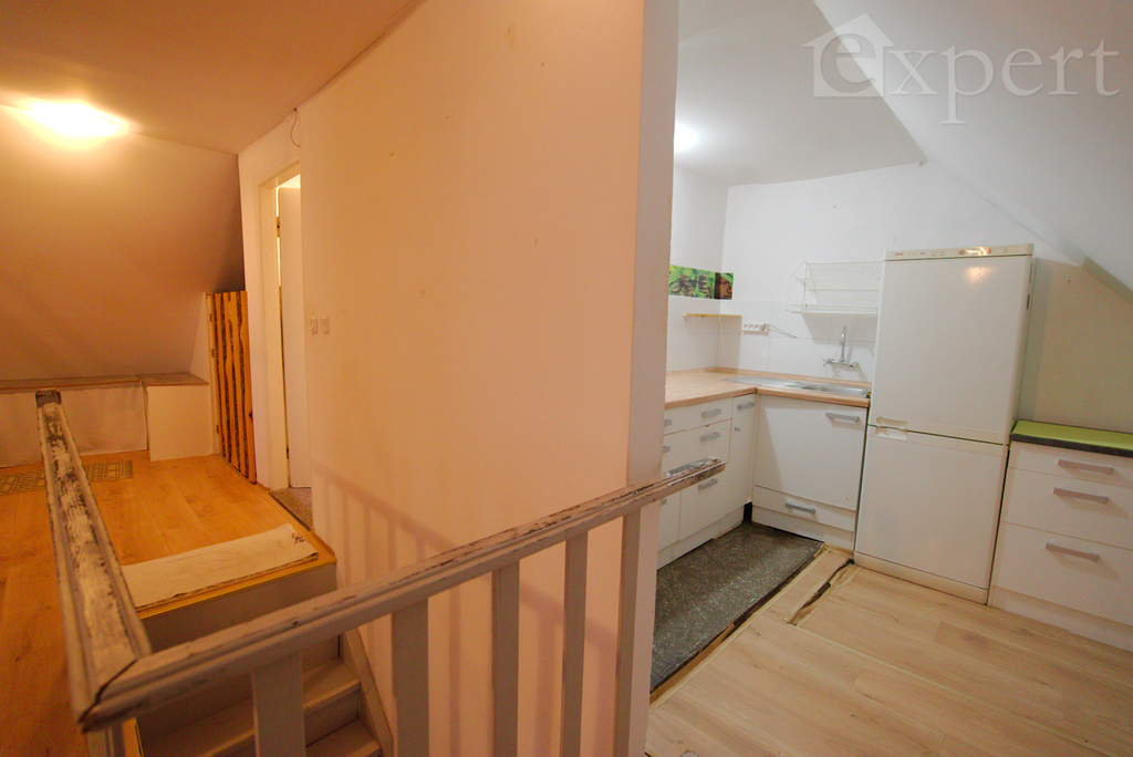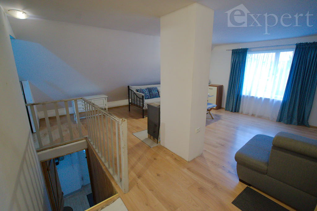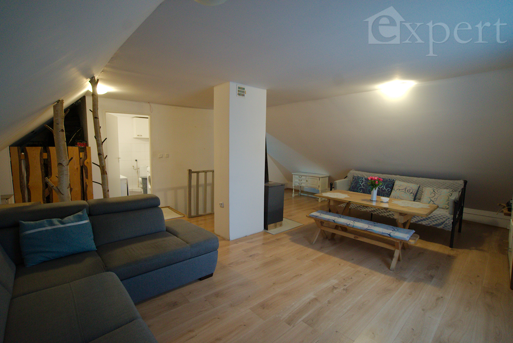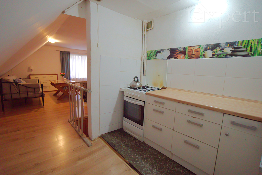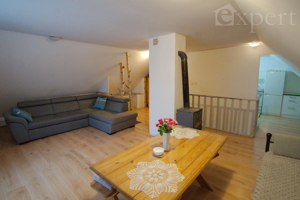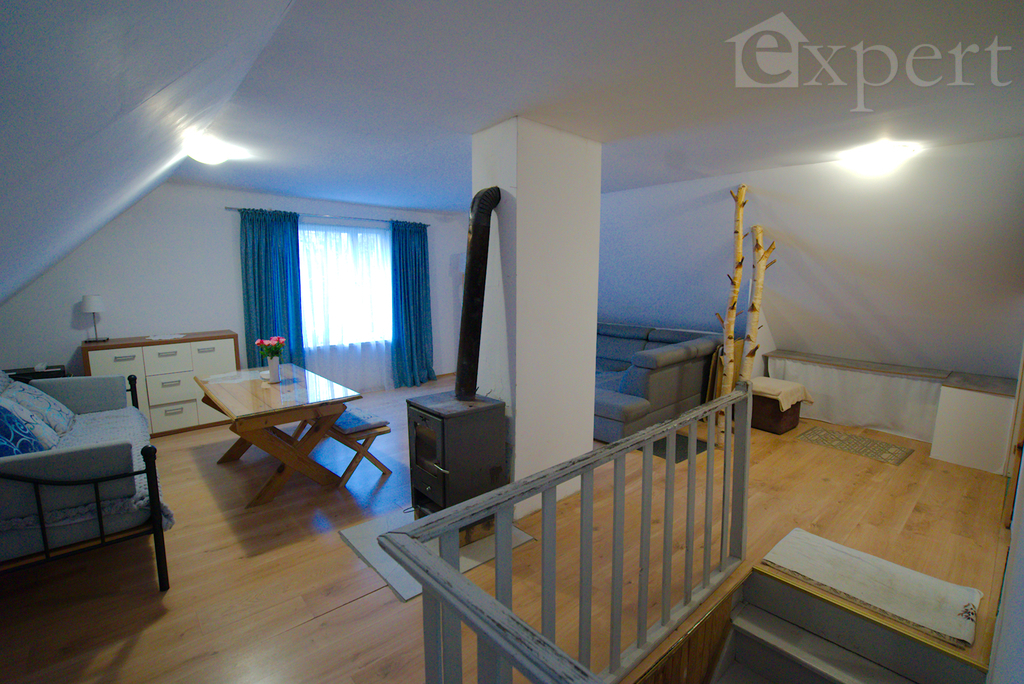 Na poddaszu jest trzecie mieszkanie z dużym pokojem dziennym, sypialnią, kuchnią i łazienką.