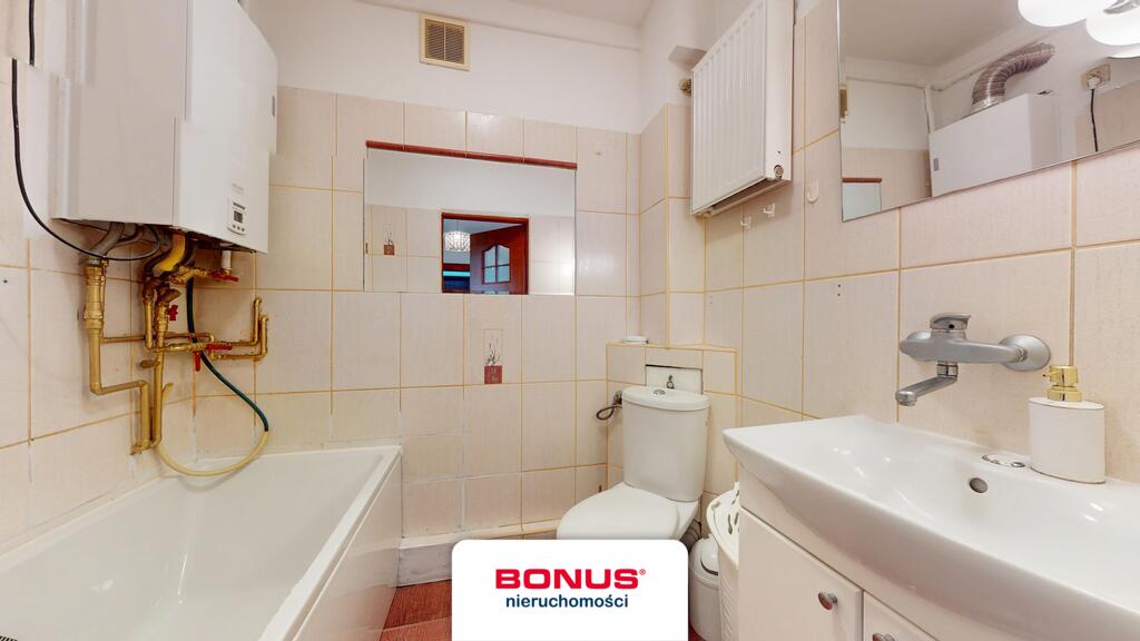 Mieszkanie o powierzchni 47,3 m2 składa się z 2 niezależnych pokoi, gdzie z większego jest wyjście na balkon, łazienki z wanną, osobnej widnej kuchni, korytarza oraz przedsionka. W łazience znajduje się piec gazowy dwuobiegowy odpowiedzialny za ogrzewanie mieszkania oraz lokalu powyżej, a także ogrzewanie wody.