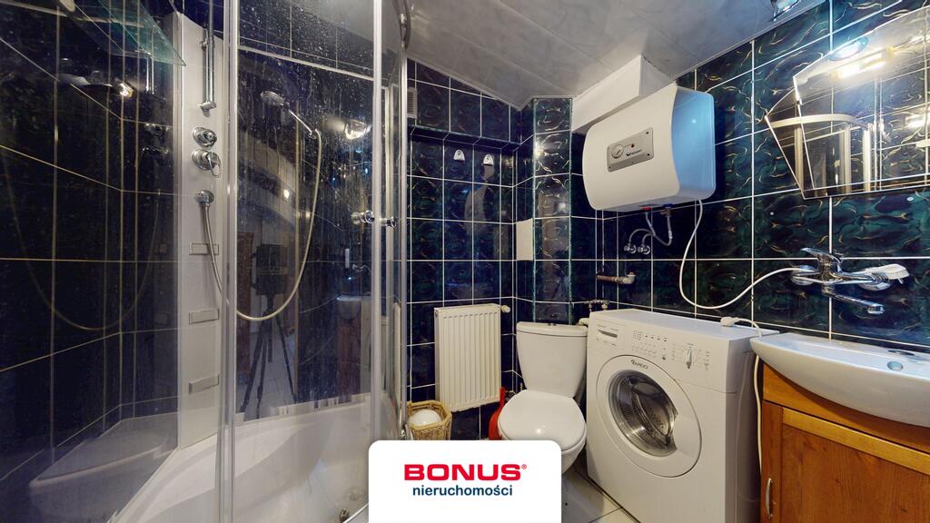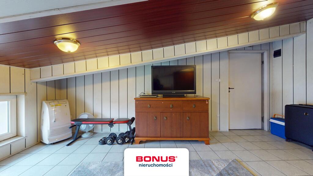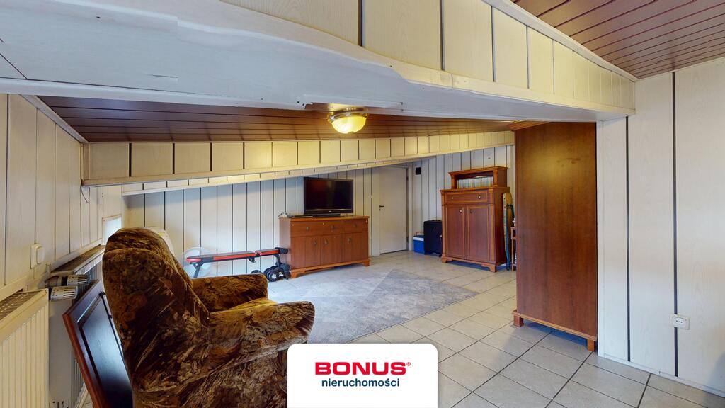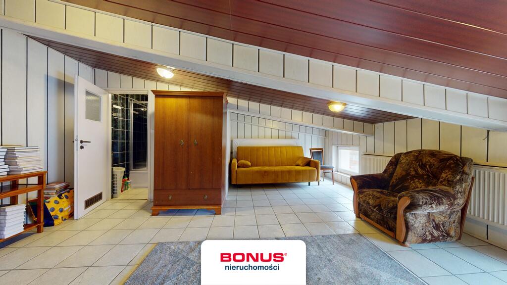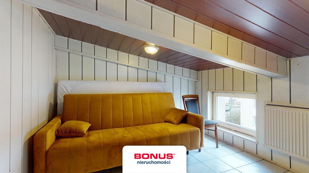Lokal niemieszkalny o powierzchni 32,2 m2 składa się z jednego dużego pomieszczenia z wyodrębnionym miejscem na kuchnie, (są doprowadzone wszystkie media, kiedyś była tam nieduża kuchnia) oraz łazienki z kabiną prysznicową. Woda w łazience podgrzewana z elektrycznego, przepływowego ogrzewacza wody. Ściany w pokoju oraz sufit obłożony panelami, na podłodze terakota. W najniższym punkcie wysokość to ok. 140 cm .