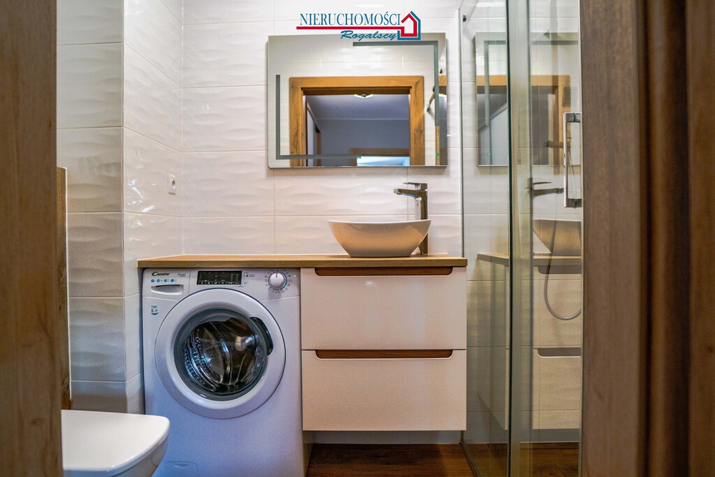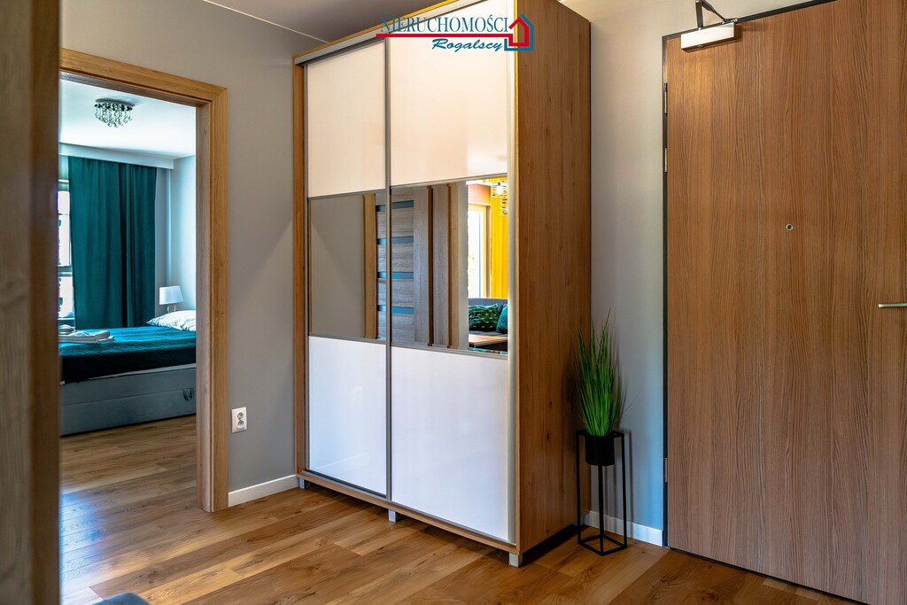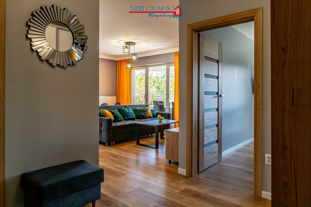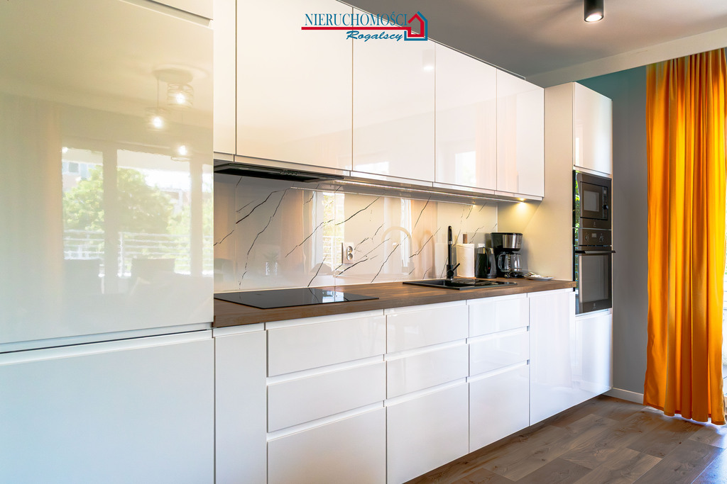 podwyższony standard: drewniane podłogi, kamienne blaty w kuchni i łazience, wysokiej jakości zabudowy stałe